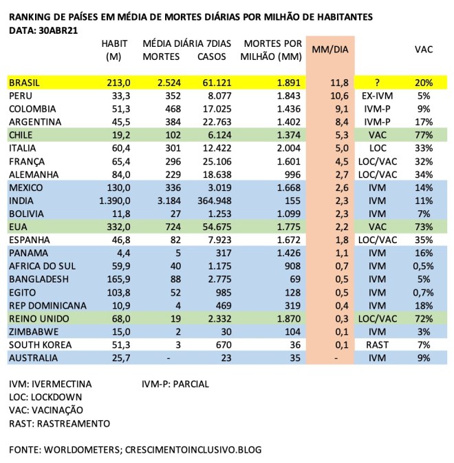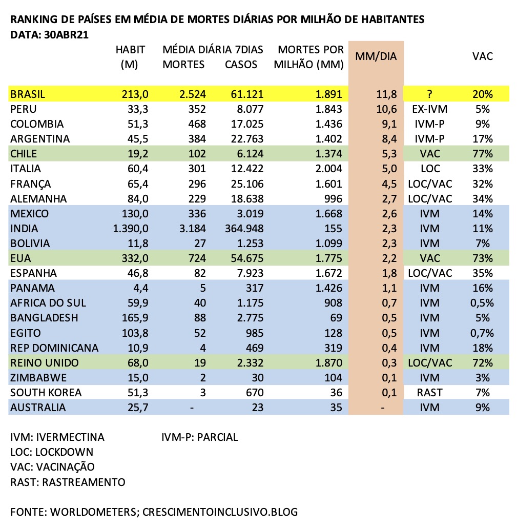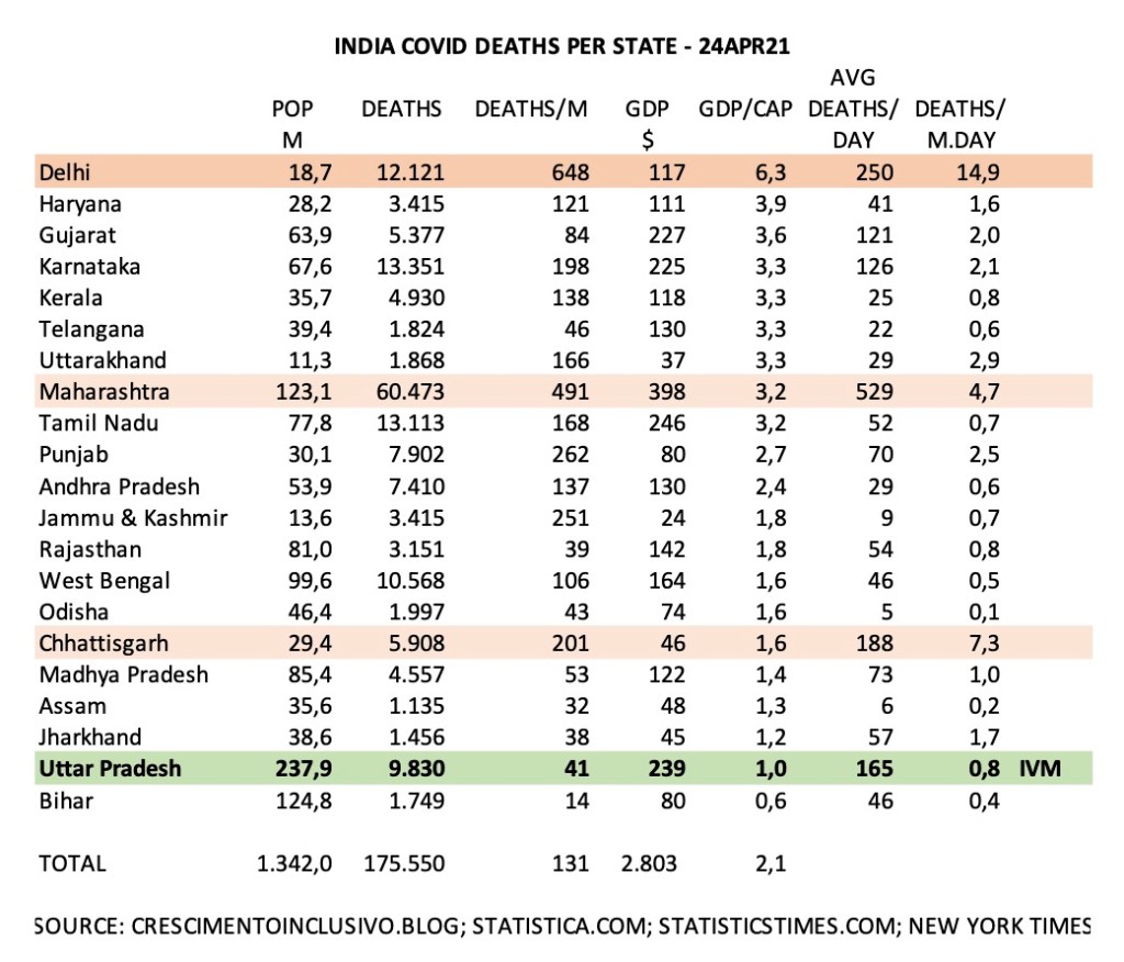 A nova variante pegou Bangladesh e Índia de surpresa. Bangladesh já controlou a situação e a Índia, tendo vários estados, implantou em 28 de abril um protocolo nacional com Ivermectina e deve ter a situação sob controle em poucas semanas. Interessante observar na Índia que os estados mais ricos em PIB/capita possuem as mortalidades mais altas. Nestes estados as autoridades sofrem influências mais fortes do exterior e criam barreiras maiores para a ivermectina. Uttar-Pradesh já tinha como política do Estado, agora Delhi também incorporou.