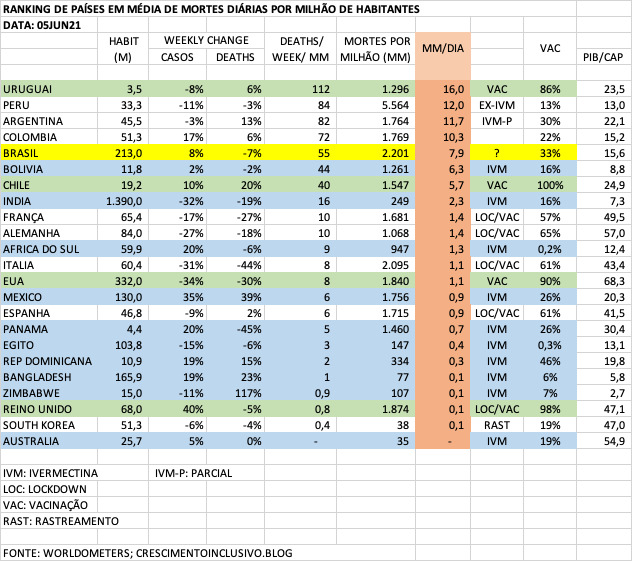 Pelo método científico devemos olhar os dados antes de chegar a conclusões. Na tabela abaixo, pode ser visto que países subdesenvolvidos como Uruguai e Chile, com alta penetração de vacinação (86% e 100%), estão com péssimo desempenho. Uruguai é o país mais mortal do mundo e Chile está com mortalidade crescente. México, país 26% vacinado que faz amplo uso de ivermectina desde janeiro, tem mortalidade inferior aos EUA 90% vacinado. Brasil como país subdesenvolvido, com pobreza significativa e dificuldade para distanciamento social, tem melhores perspectivas via ivermectina do que via vacinação.